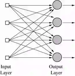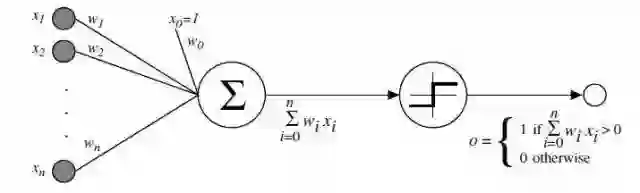 心理学家Rosenblatt构想了感知机,它作为简化的数学模型解释大脑神经元如何工作:它取一组二进制输入值(附近的神经元),将每个输入值乘以一个连续值权重(每个附近神经元的突触强度),并设立一个阈值,如果这些加权输入值的和超过这个阈值,就输出1,否则输出0(同理于神经元是否放电)。对于感知机,绝大多数输入值不是一些数据,就是别的感知机的输出值。但有一个额外的细节:这些感知机有一个特殊的,输入值为1的,「偏置」输入,因为我们能补偿加权和,它基本上确保了更多的函数在同样的输入值下是可计算的。这一关于神经元的模型是建立在沃伦·麦卡洛克(Warren McCulloch)和沃尔特·皮兹(Walter Pitts)工作上的。他们曾表明,把二进制输入值加起来,并在和大于一个阈值时输出1,否则输出0的神经元模型,可以模拟基本的或/与/非逻辑函数。这在人工智能的早期时代可不得了——当时的主流思想是,计算机能够做正式的逻辑推理将本质上解决人工智能问题。