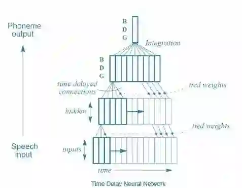 Alexander Waibel等人(还有Hinton)提出的解决方法之一,在1989年的「 Phoneme recognition using time-delay neural networks」中得到了介绍。这些时延神经网络和通常意义上的神经网络非常类似,除了每个神经元只处理一个输入子集,而且为不同类型的输入数据延迟配备了几套权重。易言之,针对一系列音频输入,一个音频的「移动窗口」被输入到神经网络,而且随着窗口移动,每个带有几套不同权重的神经元就会根据这段音频在窗口中位置,赋予相应的权重,用这种方法来处理音频。画张图就好理解了: