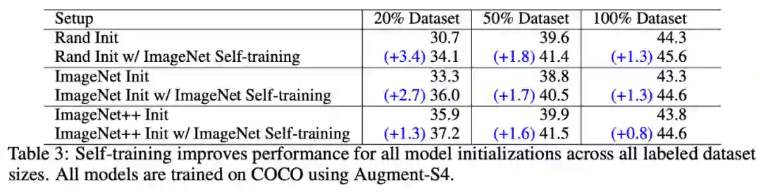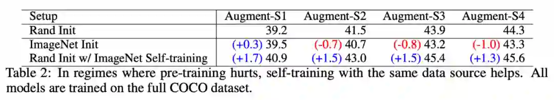 与预训练不同,在提供更强大的数据增强时,自训练通常起到积极作用,不论是在低数据机制还是高数据机制下;