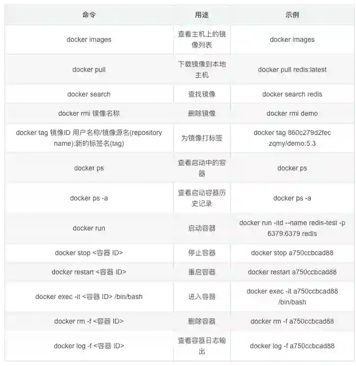 关于镜像、容器、Dockerfile 常用的操作命令如下: