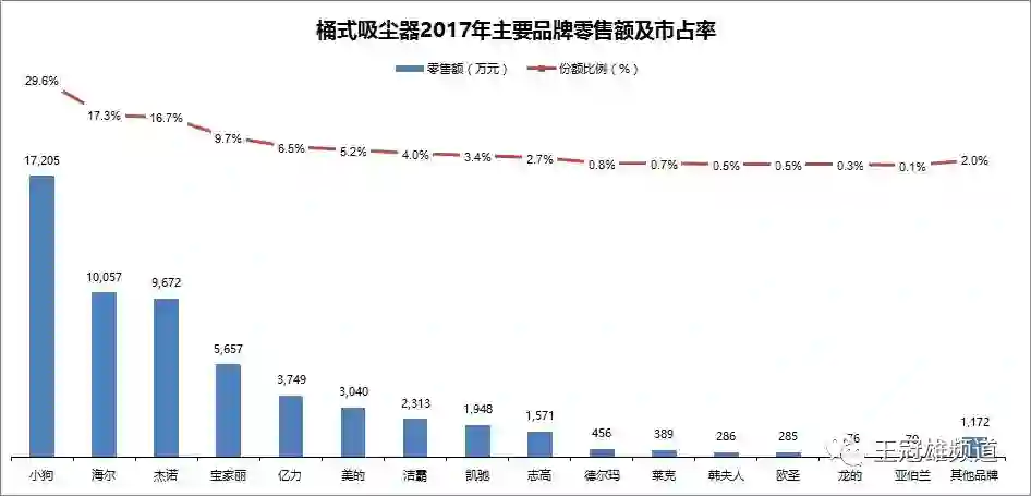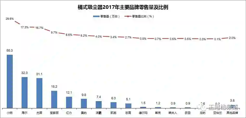 中怡康是专注中国消费品市场零售研究,也是国内最早做家电市场研究机构之一。根据中怡康发布的最新调查结果,2017年小狗电器吸尘器产品线上销售量位居第二,持续保持了品牌优势地位;同时,2017年小狗桶式吸尘器产品线上零售量、零售额均位居第一,并遥遥领先于其他品牌。在清洁家电领域,面对一线世界大厂,小狗电器的成绩再次诠释了专业和聚焦的重要性。