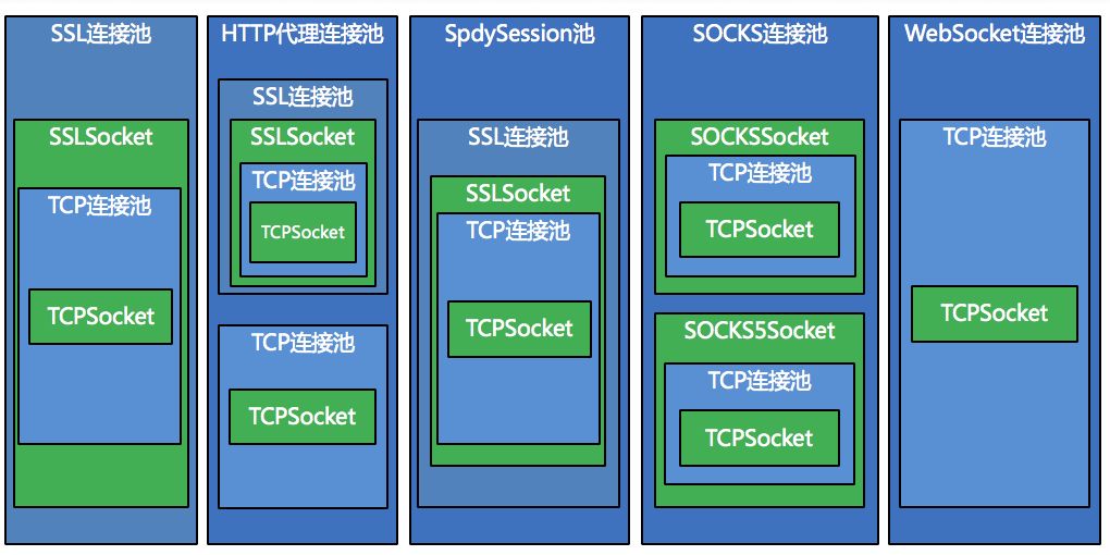 有高级连接池,包括 HTTP 代理连接池(管理 HTTP 代理请求的连接),SpdySession 连接池(管理 SPDY 和 HTTP/2 请求的连接),SOCKS 连接池(管理 SOCKS 和 SOCKS5 代理的连接),SSL 连接池(管理 HTTPS 请求的连接)。