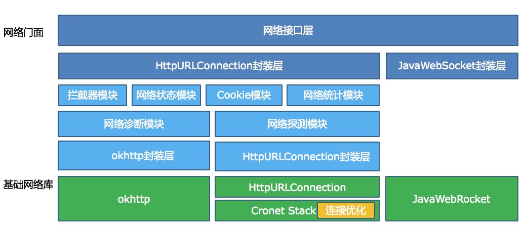 我们的中心思想是以系统网络库的 API 调用接口为中心,上层建立网络门面,供外部便捷调用,底层通过系统机制以 AOP 的方式将 cronet(chromium 的 net 模块)注入进系统网路库,达到双端网络架构统一,能力复用。