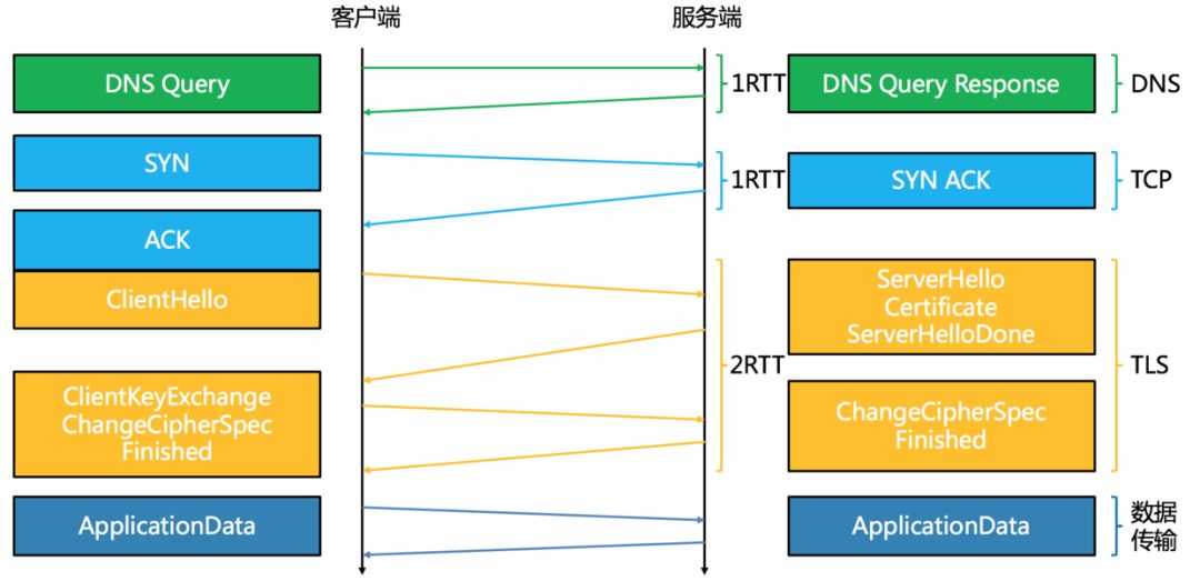 综上所述,DNS,TLS,TCP 握手阶段用了 4 个 RTT 才到了 ApplicationData 阶段,也就是数据开始传输阶段。