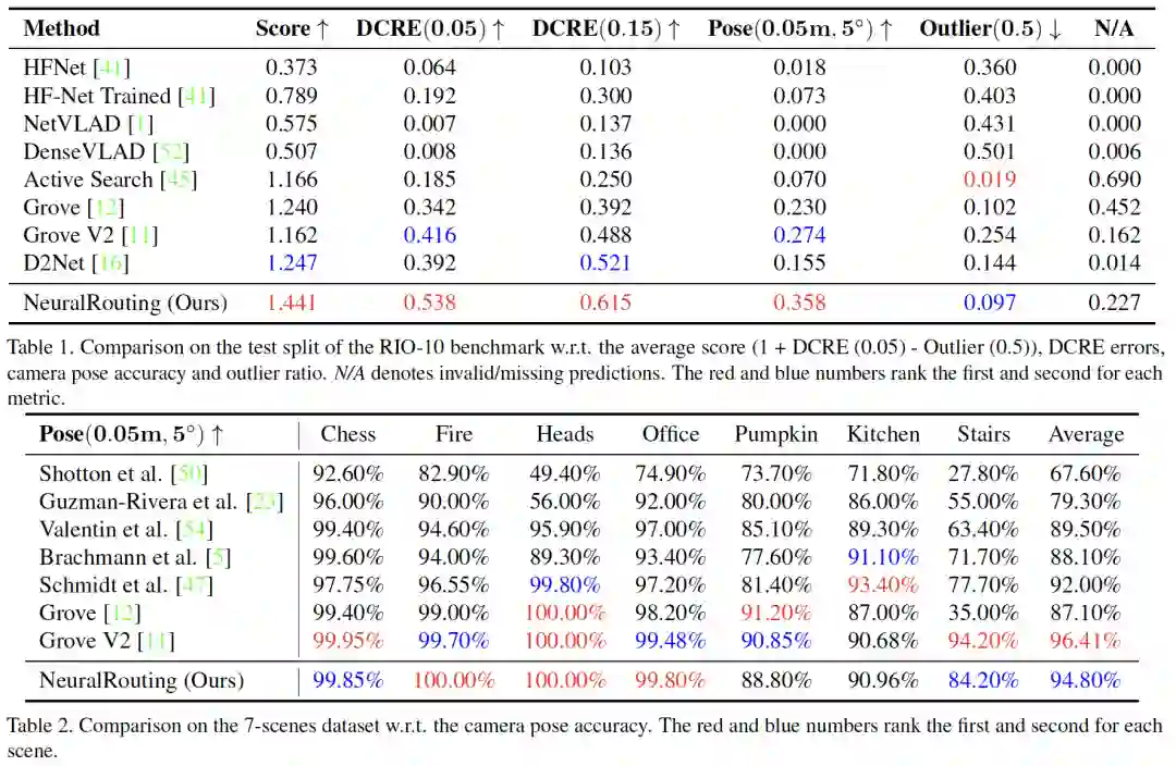 RIO-10和7-Scenes数据集的实验结果,红色标注最优,蓝色标注次优