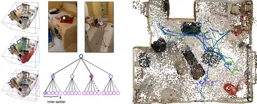 相机重定位研究在已知环境中根据 RGB-D 图像推算相机的位置姿态,是实现场景建模、增强现实、机器人导航等技术的基础。近年来,最先进的研究工作通常 (A) 先记忆和推测所观测到不同对象的位置;(B) 再通过这些对象位置的相对关系反算自身位姿。对于 (A),被观测对象的位置信息通常表示为图像像素坐标和场景世界坐标之间的对应关系(2D/3D-3D correspondences),使用决策树、神经网络等机器学习模型实现;对于 (B),通常表示为局部坐标系与世界坐标系之间的刚体变换,使用 Perspective-n-Point、orthogonal Procrustes 等非机器学习算法求解。