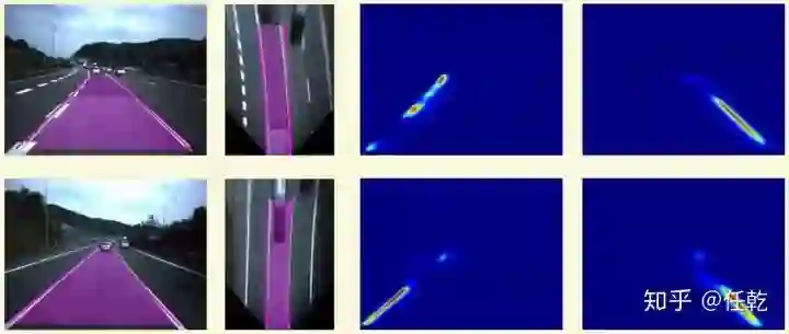 为了更好的展示网络的中间过程,作者在这张图片的右半部分展示了权重的热度图,从图中可以看出,权重高的地方确实都是在车道线上。