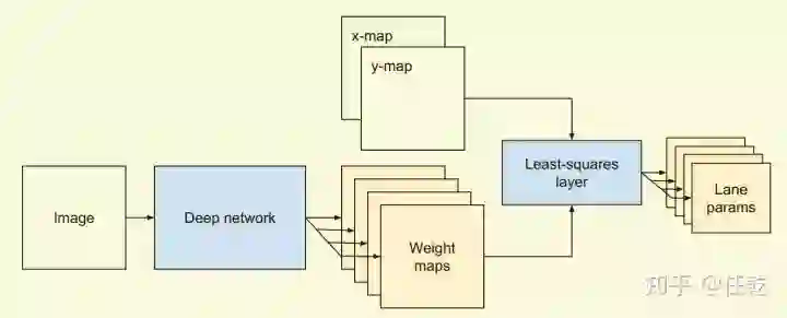 该网络的两个部分区分的很明显,一个“Deep network”负责给像素打上权重值,另一个“Least-squares layer”负责拟合车道线参数。所以这一部分没太多好介绍的。