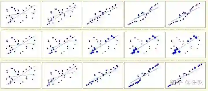 这张图里三色的点指的是像素,点越大代表权重越大,绿色直线代表ground-truth给的真值,黑色的直线代表网络估计的值。三行代表三种方式,每一行从左到右代表收敛过程。下面结合这种图分别说一下三种方式: