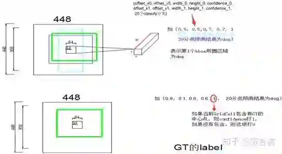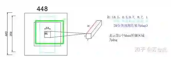 比如说output第2行,青色的5维信息,对应左图中青色的bbox,其中心点相对于grid cell左上角的Offset是32, receptive field的size64,所以第一个参数是0.5