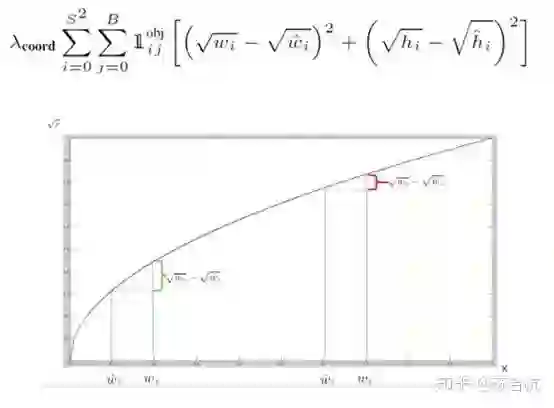 1.这里可以看出来,对于bbox的预测,如果grid cell,里面有object,那么示性函数为1,计入此项的loss(如果2个bbox中心点都在有object的grid cell里面,则取IOU较大的那个bbox,计算loss),如果grid cell没有object,那么示性函数为1则bbox的loss就不用叠加到总的loss上了。(ij表示第i个grid cell里面的第j个bbox)