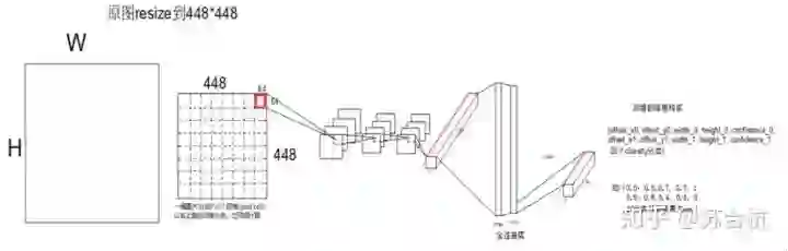 测试图片resize之后,进入backbone,产生1个7*7*1024的feature map, 这个上面的一共有49个1*1*1024的tensor,每1个tensor对应resized image上面一个区域。将这个feature map过全连接,输出7*7*30的output,每个1*1*30的tensor,就对应resized image上面1个grid cell