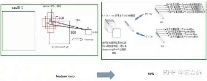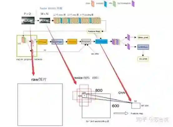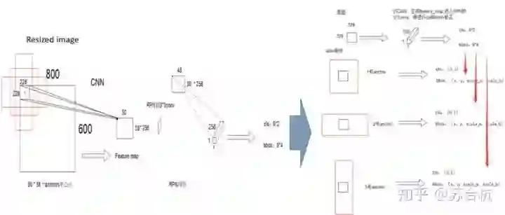 Backbone以vgg16为例,原始图resize成800*600,经过VGG,输出特征图50*38*256,每张图Feature map上1个点,对应的感受野为228 * 228,以这个感受野的中心为锚点,生成9个固定尺寸(128^2, 256^2,512^2)的bbox(例图只画了3个示意)