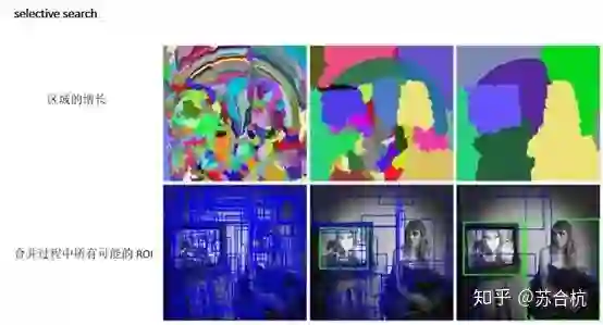 下图第一行展示了如何使区域增长,第二行中的蓝色矩形代表合并过程中所有可能的 ROI。
