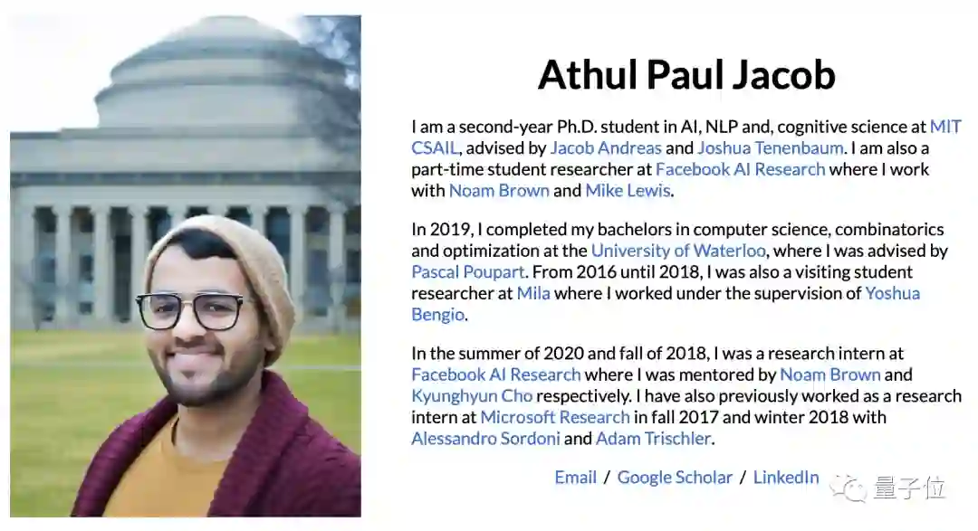 Athul Paul Jacob同时也是MIT CSAIL的二年级博士生,从2016年到2018年,他还在Mila担任访问学生研究员,在Yoshua Bengio手下工作,与Bengio共同发表了多篇论文。