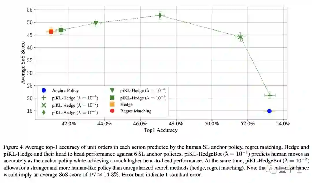 在下图中,piKL-Hedge(绿色)可以生成预测人类博弈的策略,其准确度与模仿学习(蓝色)相同,同时性能强1.4倍。