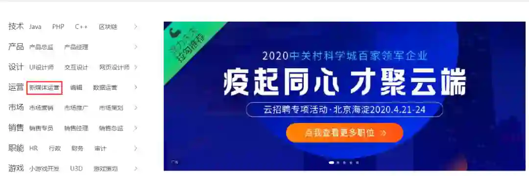 以专做互联网招聘的拉勾网为例,运营类岗位中,他们已经把新媒体运营放在二级菜单首位显示。