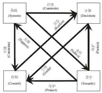 这4个层面之间的逻辑关系如下图所示, 其中系统层面通过体系架构的限定作用对决策和控制形成了约束, 同时对信息安全层面的问题具有诱导作用; 安全层面对整个系统的信息安全具有支撑作用, 对决策与控制过程形成信息保护; 决策层面对控制层面具有引导作用, 而控制层面主要是对决策的实现, 同时对决策层面也具有一定的约束作用.