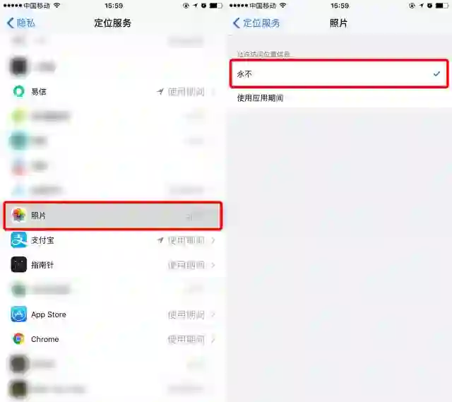 目前,大多数只能手机APP都需要获取用户的位置信息,对于对位置要求不高的APP而言,最好的办法是关掉位置权限,以苹果手机为例,照片定位关闭路径:设置→隐私→定位服务→相机→永不