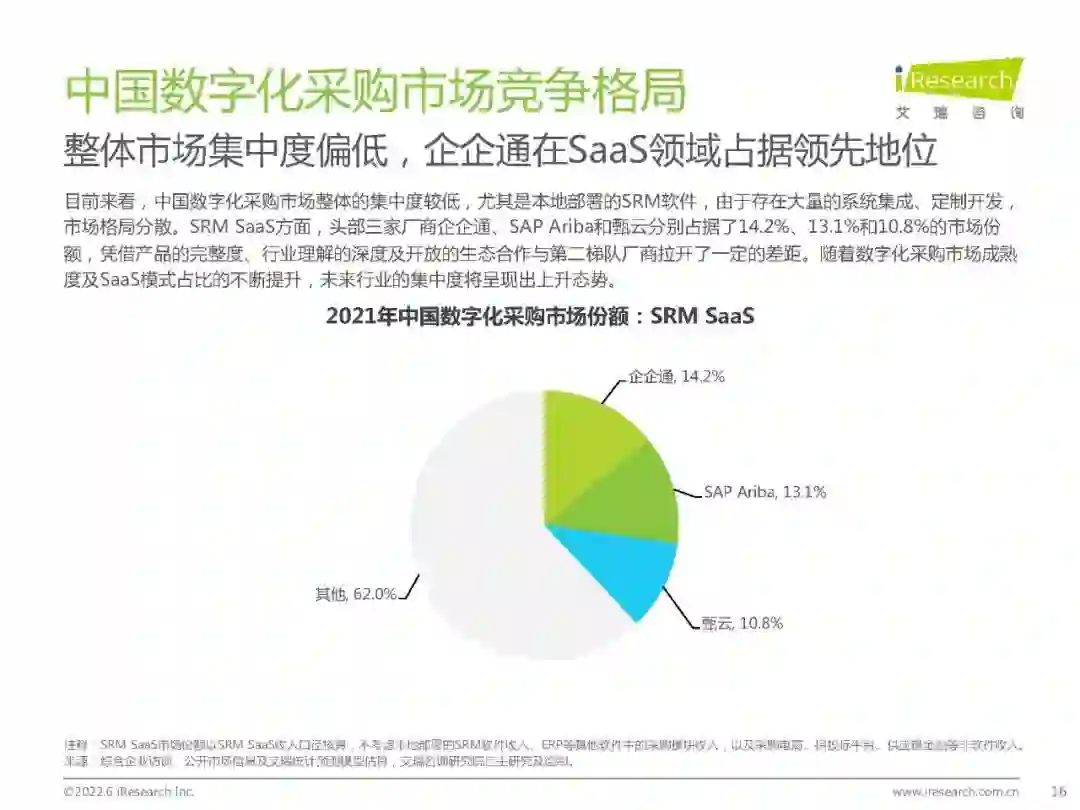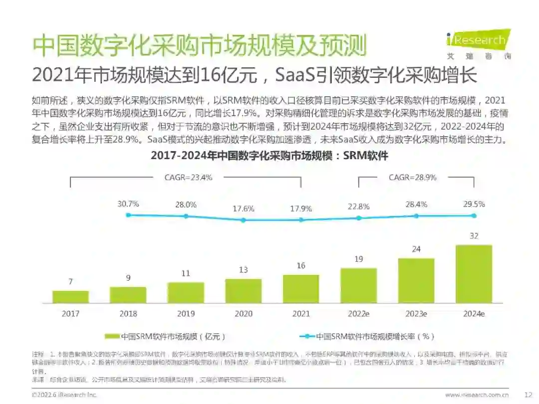 以SRM软件的收入口径核算目前已采买数字化采购软件的市场规模,2021年中国数字化采购市场规模达到16亿元,同比增长17.9%。考虑企业节流意识的不断增强,预计到2024年市场规模将达到32亿元,其中SaaS收入将成为市场增长的主要动力。