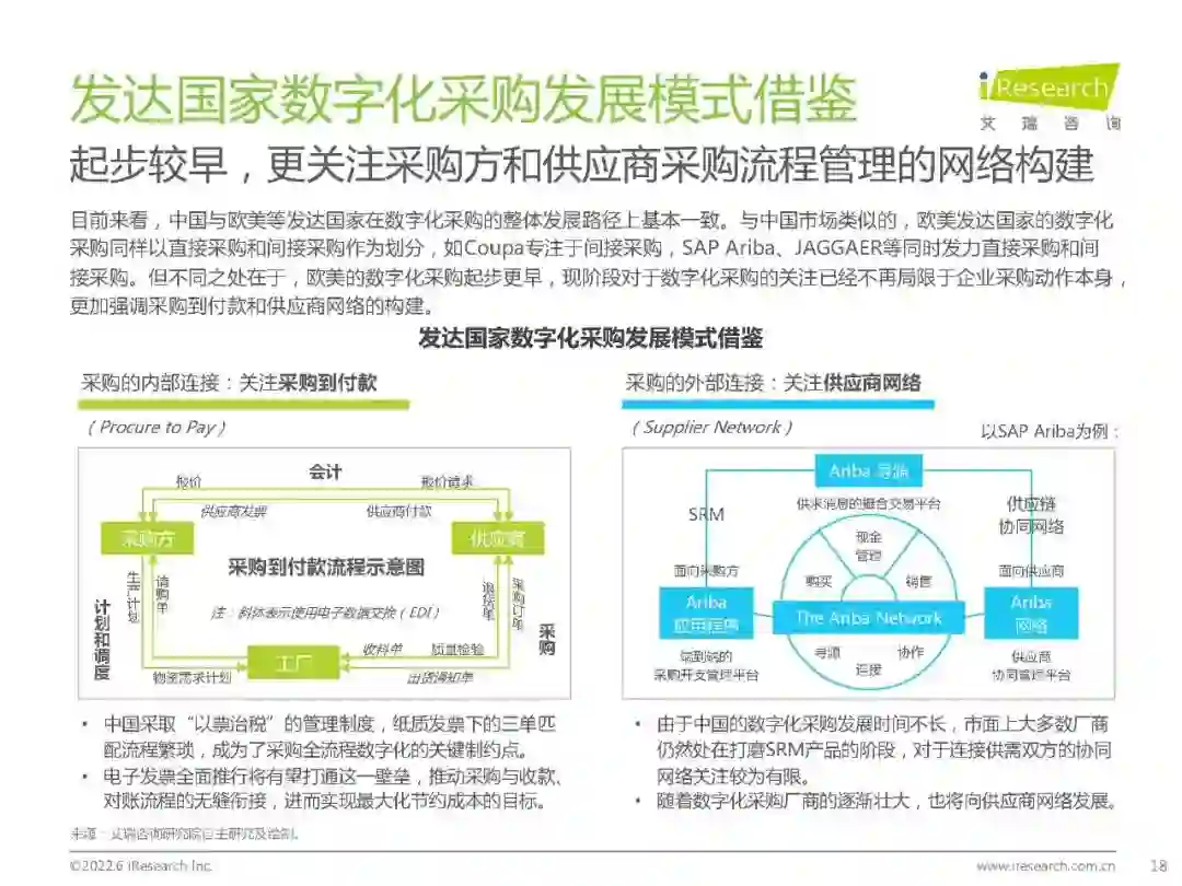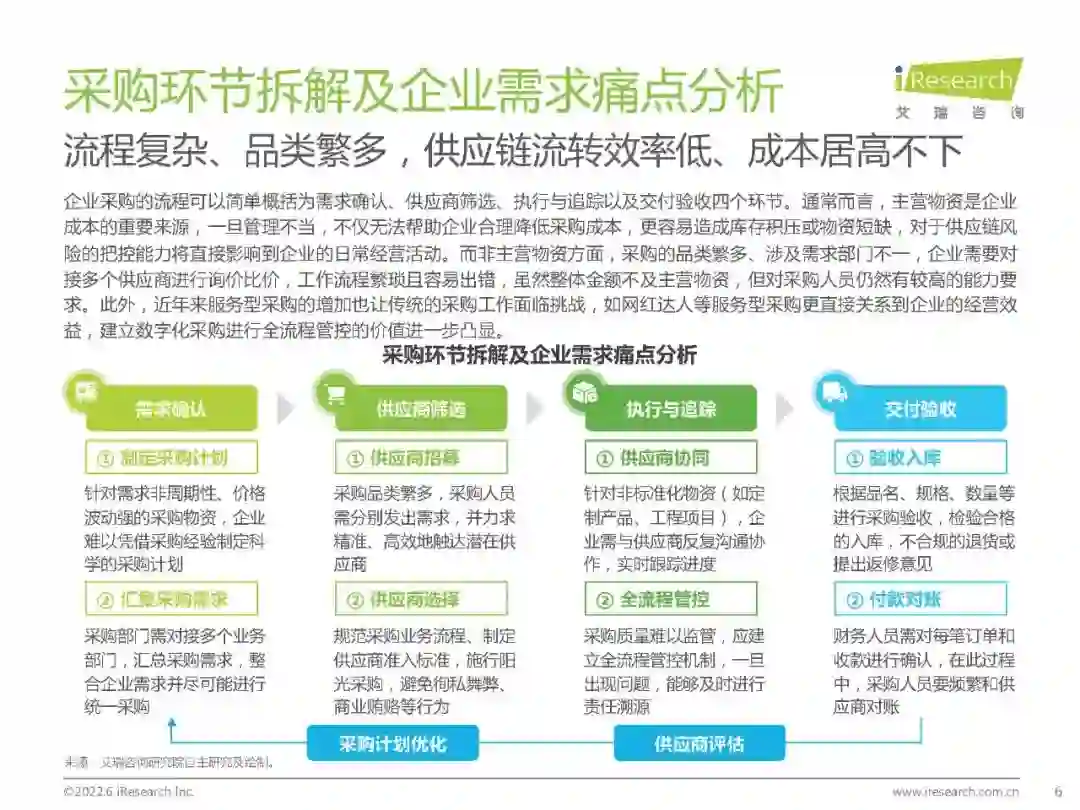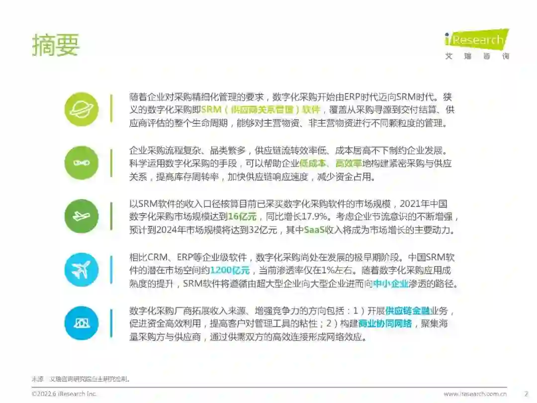 随着企业对采购精细化管理的要求,数字化采购开始由ERP时代迈向SRM时代。狭义的数字化采购即SRM(供应商关系管理)软件,覆盖从采购寻源到交付结算、供应商评估的整个生命周期,能够对主营物资、非主营物资进行不同颗粒度的管理。