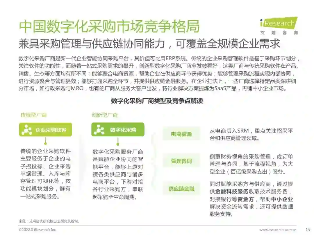 数字化采购厂商拓展收入来源、增强竞争力的方向包括:1)开展供应链金融业务,促进资金高效利用,提高客户对管理工具的粘性;2)构建商业协同网络,聚集海量采购方与供应商,通过供需双方的高效连接形成网络效应。