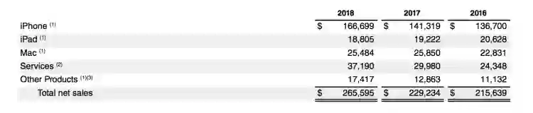 与之相反,服务产品近三个财年逐年增长,营收额为:2018年371.9亿美元,2017年299.8亿美元,2016年243.48亿美元。