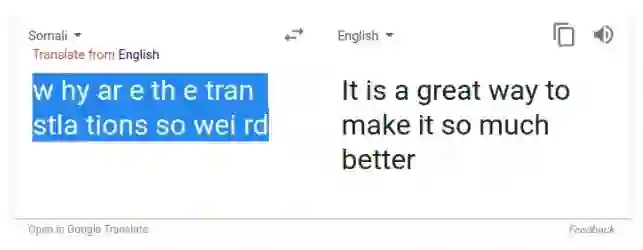 你看,用Google Translate翻译“w hy ar e th e tran stla tions so wei rd”在索马里语中的意思,它的输出是,“这是一个让它变得更好的好办法”。