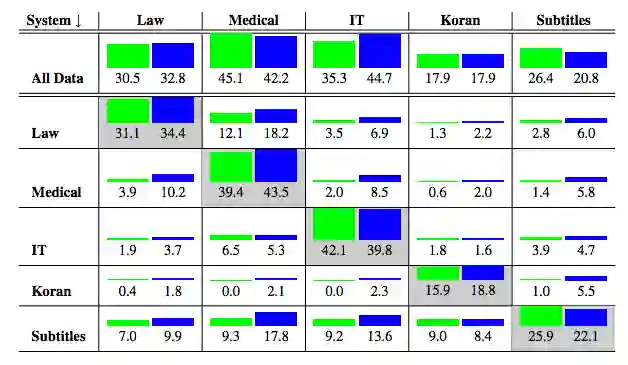 1. 神经机器翻译(NMT)在处理领域之外的数据时的表现很糟:当前的机器翻译系统会生成非常流畅的输出,这些输出与领域外数据的输入无关。因此像Google翻译这样的通用机器翻译系统在法律或金融等专业领域的表现尤其糟糕。与基于短语的系统等传统方法相比,NMT系统的效果更差。有多差呢?请参阅下面的图表。非对角线上元素是是用领域外数据训练后的结果,绿色条代表NMT,蓝色条代表基于短语的系统。