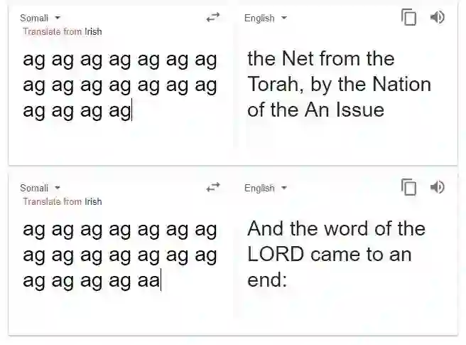 这只是Reddit以及其他网站用户从谷歌翻译中挖掘出来的众多怪异、有时甚至是不祥的翻译的一个例子。将原文设为索马里语,连续输入“ag”一词,这个字符串会被翻译成“sons of Gershon”(革顺的儿子),“name of the LORD”(上帝的名字),并且会引用圣经里的术语,例如“cubits”(肘,圣经中的度量衡)和Deuteronomy(《申命记》)。谷歌翻译是谷歌已经推出10年的服务,现在可以翻译超过100种语言。