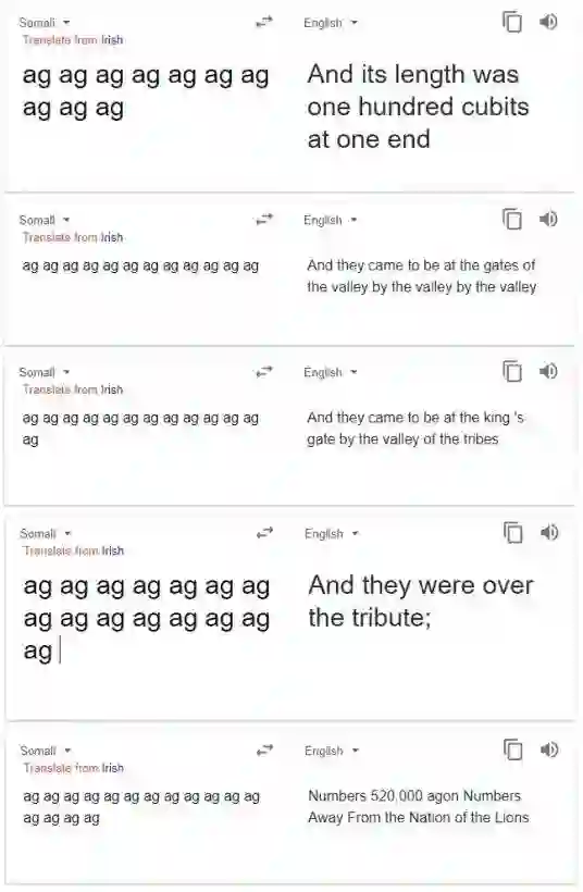 Rush也同意这种说法,如果谷歌使用《圣经》来训练它的神经翻译模型,那么就可以解释一些奇怪的输出了。事实上,索马里语的几个奇怪的翻译版本与《旧约》中的某些章节很相似。比如《出埃及记》27:18提到“a hundred cubits”(长一 百肘),并且有几节经文,包括《民数记》3:18讨论了“sons of Gershon”(革顺的儿子)。