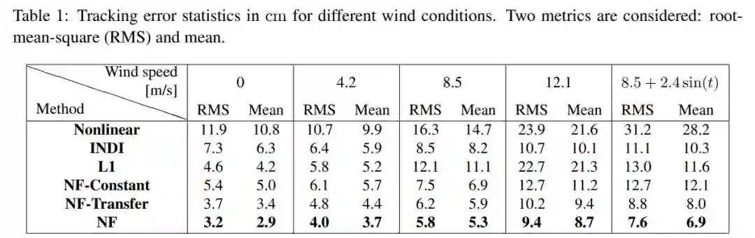 研究者将 Neural-Fly 与两个变体进行了比较,它们分别是 Neural-Fly-Transfer 和 Neural-Fly-Constant。其中,NF-Transfer 使用从不同无人机的数据上训练学得的表示,而 NF-Constant 仅使用具有 trivial 非学习基础的自适应控制律。