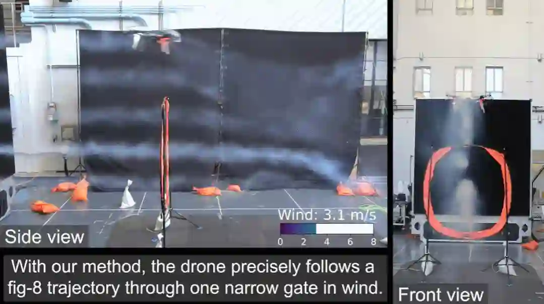 文章开头我们已经初步见识到了无人机的抗风能力,下面展示了一架四旋翼无人机,借助该研究开发的工具,它可以在风速达到 27 英里 / 小时的情况下完成 8 字形穿梭操作: