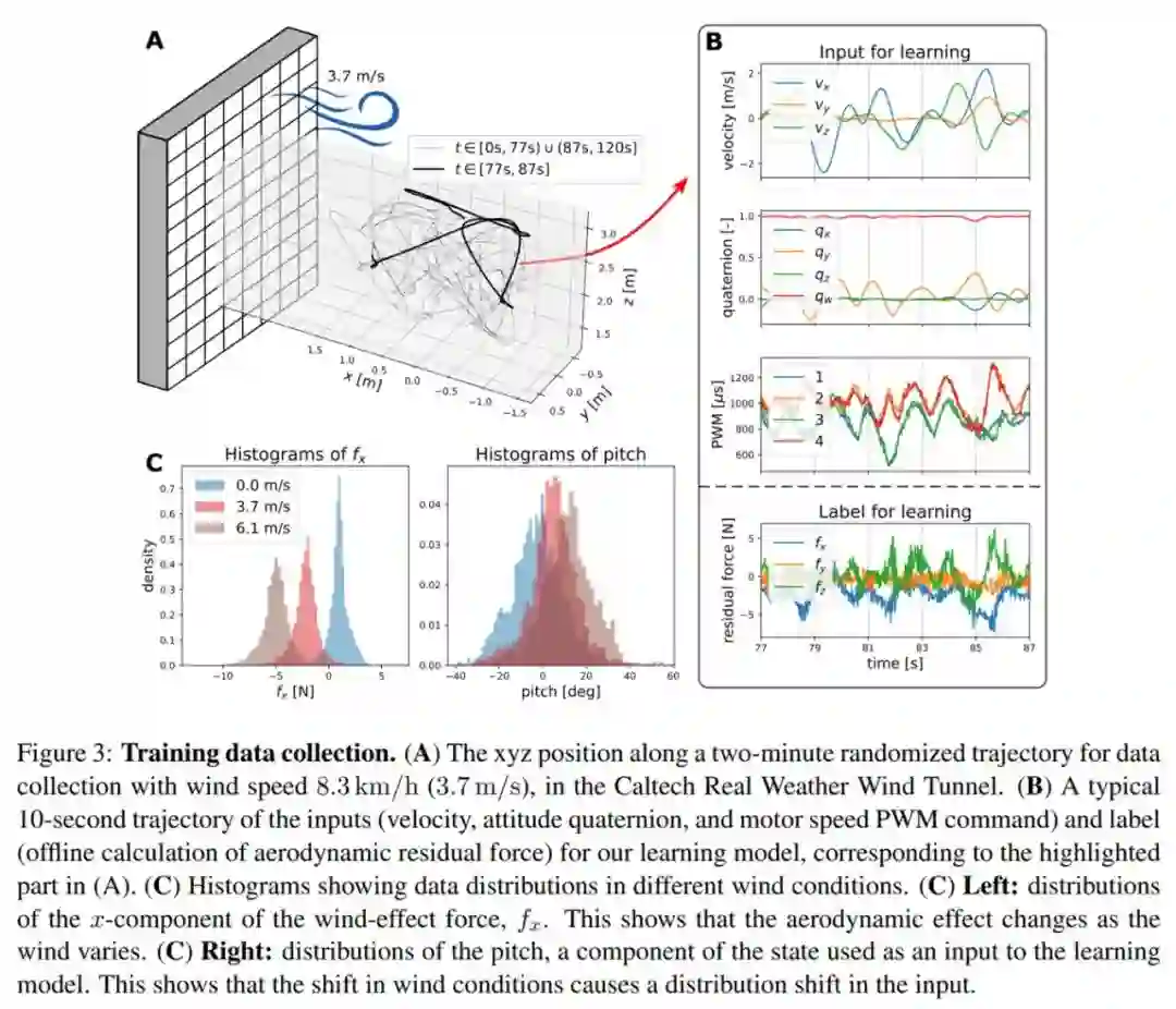 加州理工学院的研究者提出的「Neural-Fly」是一种数据驱动方法,它作为一种基于深度学习的轨迹跟踪控制器,可以学习快速适应快速变化的风况。下图 3(A) 为数据收集过程;3(B) 为风速 13.3km/h (3.7m/s) 的情况下,训练数据的输入和标签;3(C) 为不同风况下输入数据和标签数据的分布。