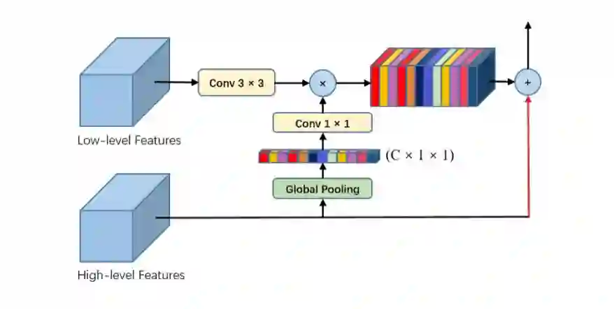 通过该注意力机制,实现了high-level feature在特征融合时对low-level feature的引导,加强了生成的feature map中高层feature的信息。