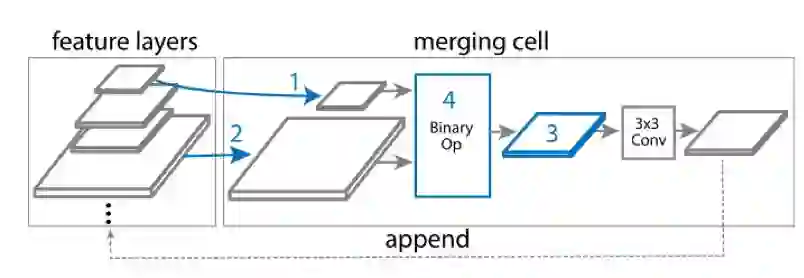 该图直观地展示了Merging cell的机制:从现有的feature map集中不放回地任意选取两个feature map;->选择输出的分辨率;->选择此次的Binary Op,将选择的两个feature map融合并按照上一步选择的分辨率生成新的feature map;->将新生成的feature map添加到feature map集从而可基于此生成的feature map进一步搜索。