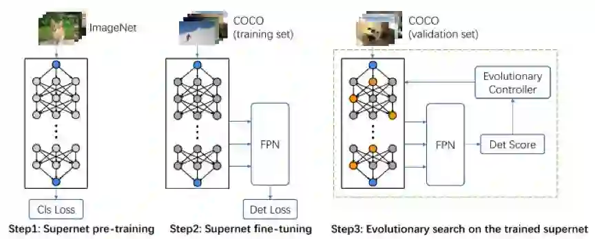 不同于NAS-FCOS与NAS-FPN,DetNAS向着backbone的搜索发起了冲击。通常目标检测使用的backbone是为图像分类设计的,某种程度上是次优的选择。该论文首次使用NAS对目标检测的backbone展开搜索;基于one-shot supernet,其搜索步骤如下: