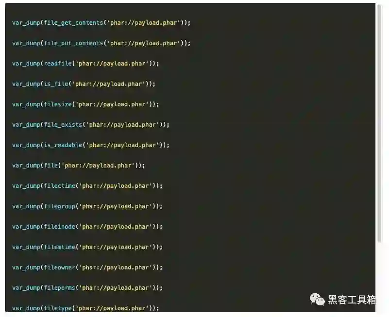 刚看到一片文章,就是在对phar文件进行操作的时候可以导致反序列化,然后我就对php内置函数进行了测试,发现80%的常用文件操作都能导致触发phar的反序列化,我一共测试了如下函数,都可以触发。