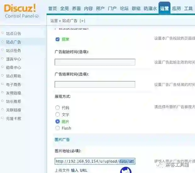 添加一个新的广告,把之前生成的phar修改成jpg上传上去,并拿到路径