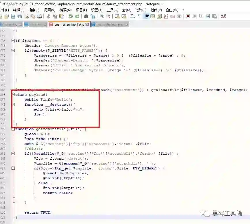我在/source/module/forum/forum_attachment.php加了一个payload类,测试看看有没有执行成功。