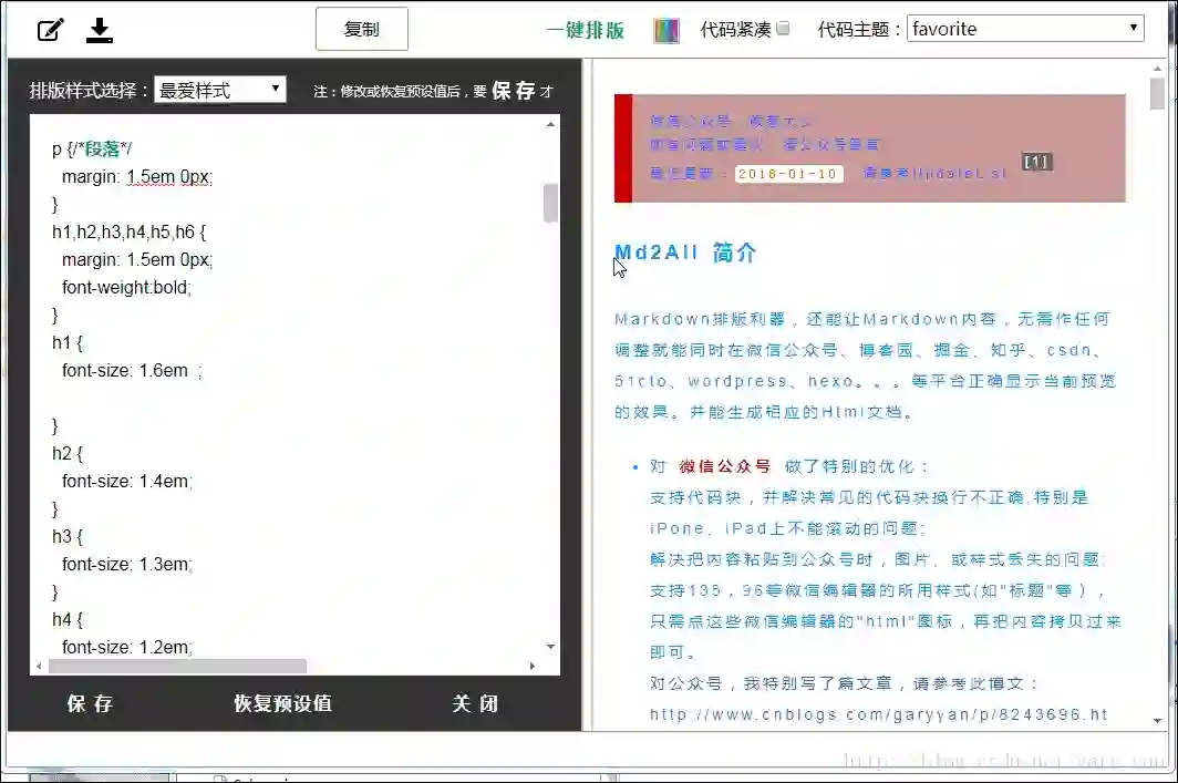 Markdown排版利器,支持 "一键排版" 的样式模板选择,支持"css样式自定义",支持80多种代码高亮。