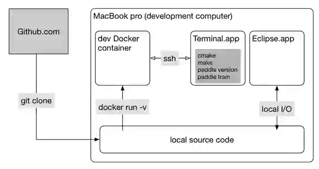 基本思路是:使用git clone下载PaddlePaddle源码到开发机,然后就可以使用自己最喜欢的编辑器(如IntelliJ/Emacs)开始代码编写工作。编译和测试则可以使用docker run -v挂载源码目录到开发环境镜像,在容器中直接编译和测试刚才修改的代码。我们将在后面的实战部分举例说明。