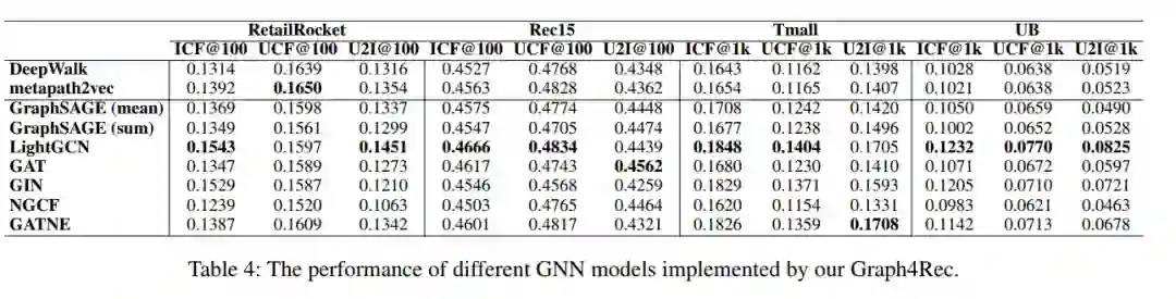 随后比较了在Graph4Rec上常用的图神经网络模型的性能比较。
