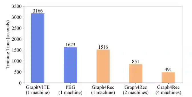 其通过对比主流的图学习系统展示了训练效率方面的优越性。其中,GraphVITE是一个通用的图嵌入引擎,PBG是一个基于Pytorch的大规模图学习系统。相比于上述两个图学习框架,本文所提出的工具包可以利用附加信息来缓解冷启动问题。