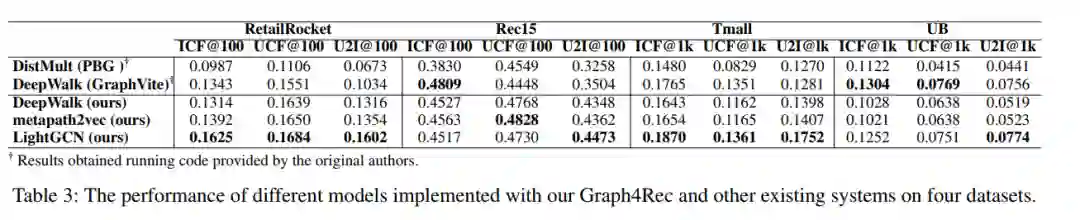 另外,还对比了上述3个常用的图学习框架利用不同的召回策略(ICF、UCF以及U2I)在不同的图嵌入算法(Deepwalk、metapath2vec、lightgcn)上的性能比较。