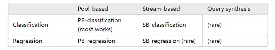 这里我们只讨论最基础的分类和回归问题。在这两类问题下,有着三种不同的主动学习场景: