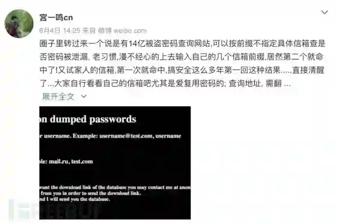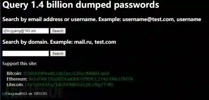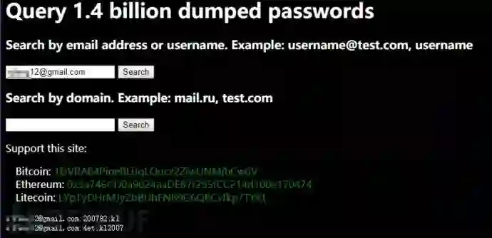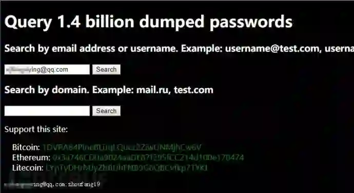 近期,网络上出现了一个14亿邮箱密码泄露信息查询网站:http://dumpedlqezarfife.onion.lu/(点击底部阅读原文访问),访问网站后,可以按照用户名或邮箱地址来查询特定邮箱是否存在密码泄露,查询结果全为明文状态的泄露密码信息。