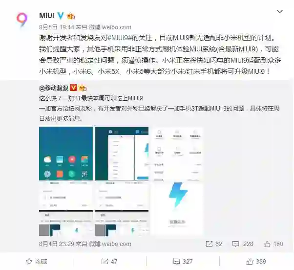 其它手机采用非正常方式刷机体验MIUI 9系统,可能会导致严重的稳定性问题