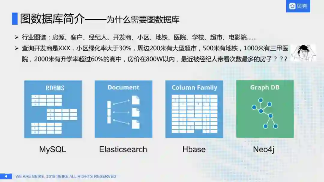 这可能是一个客户想要的房子,但是各位觉得有哪个产品可以支持么?如果说我们用传统的关系型数据库,MySQL或者Oracle可以吗?那是不是我们要关联房源表、客户表、经纪人表、开发商表等等,一次关联几十张表才可能得到想要的结果?但明显这是不现实的;那ES ( Elasticsearch ) 可以吗?ES在搜索领域非常火,它可以解决吗?其实ES也是解决不了的,ES要搜这样的房源,肯定是需要有一张很宽的房源表,那怎么搜索这套房源周边200米有大型超市?难道要建距离周边超市的距离这样一个字段吗?显然也是不现实的;HBase更不用说了。所以显而易见这种行业图谱的数据只能使用图数据库,比如Neo4j这样的存储引擎才可以支持。
