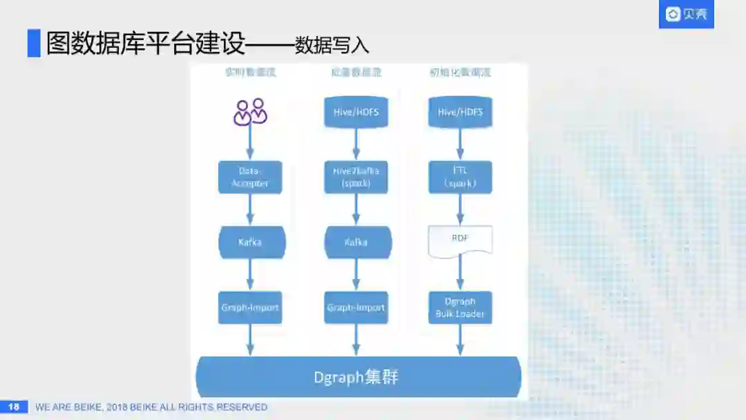 批量数据流模式:比如说要做全量的数据更新,目前贝壳大部分的行业图谱数据都是存在Hive或者是HDFS中的,这时候会有一个Hive2Kafka的spark任务,从用户的Hive表或者HDFS拿到全部的图谱数据,同样写入Kafka,最后通过Graph-Import模块从Kafka取出数据写入Dgraph集群。